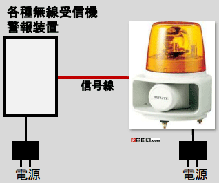 呼び鈴を使って10〜15m離れた回転灯を一定時間だけ回転させます。業務連絡や周囲への警告に。